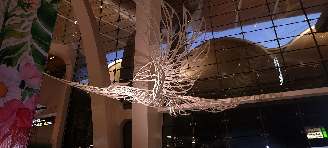 “栖云”以“岭南神鸟”为核心创意——艺术家将广东省鸟白鹇融入设计,为往来旅客打造了一场充满诗意的“接风洗尘”仪式。作品由两只形态互补的“神鸟”构成:一只身姿舒展,如岭南山水般写意流畅;一只轮廓利落,似机场钢结构般现代简约,巧妙实现了自然灵韵与工业美学的梦幻联动。值得一提的是,这对重达数吨的“大鸟”暗藏“黑科技”:通过隐藏式受力设计实现悬浮效果,镜面材质的羽翼实时倒映航站楼内的流动人影与光影;智能光线系统更能随旅客脚步变换色调,营造出灵动多变的视觉体验。它们盘旋云端的姿态,仿佛在轻声问候每一位旅人“一路辛苦啦,欢迎来到广州!”,让岭南之旅从抬头的第一眼便充满优雅与温暖。